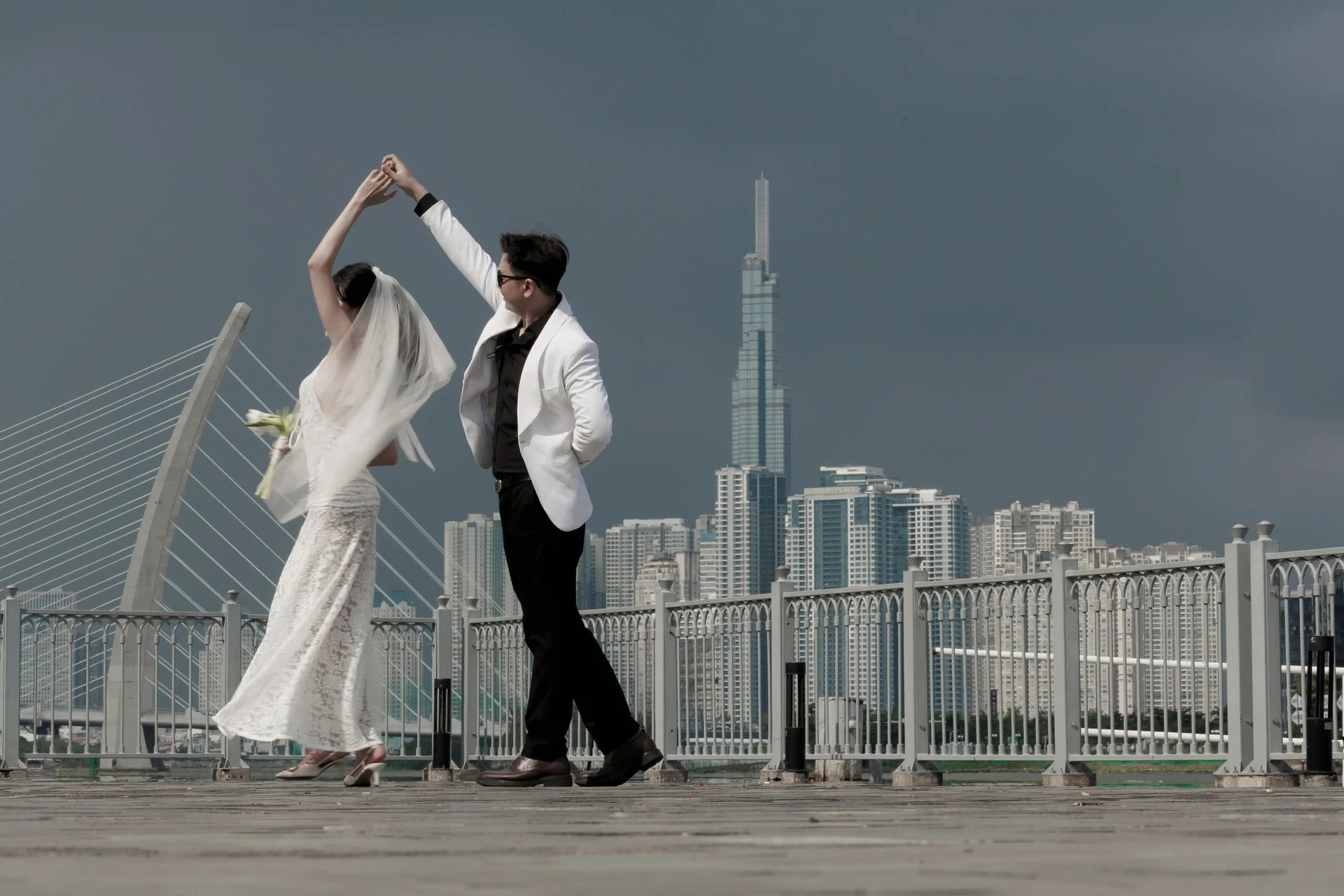 Bức ảnh cô dâu, chú rể là của khách hàng được anh chụp từ trước, với vị trí từ bến Bạch Đằng (quận 1). Còn khoảnh khắc tiêm kích thả bẫy nhiệt được anh chụp vào sáng 30/4, với góc chụp từ công viên bờ sông (TP Thủ Đức).