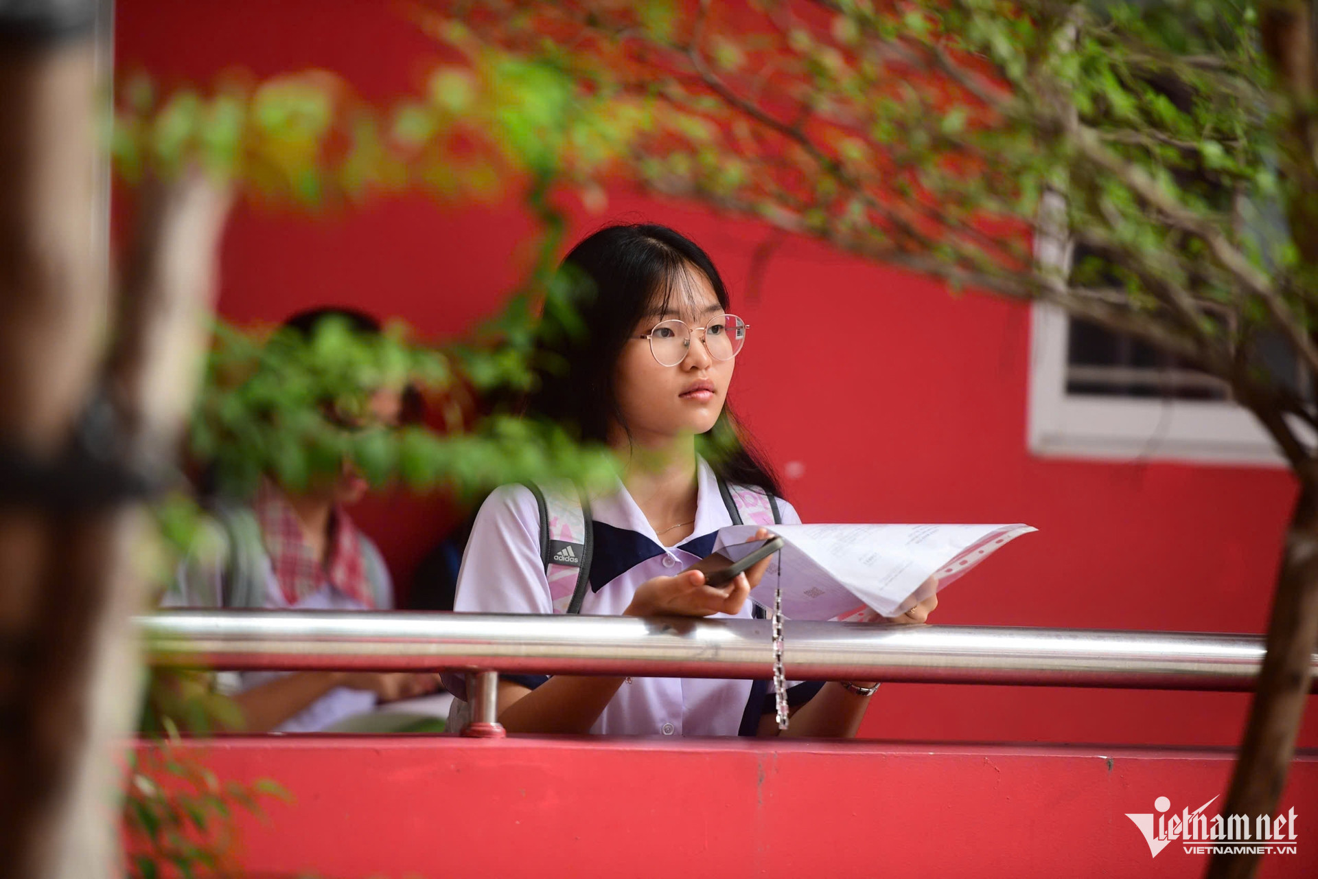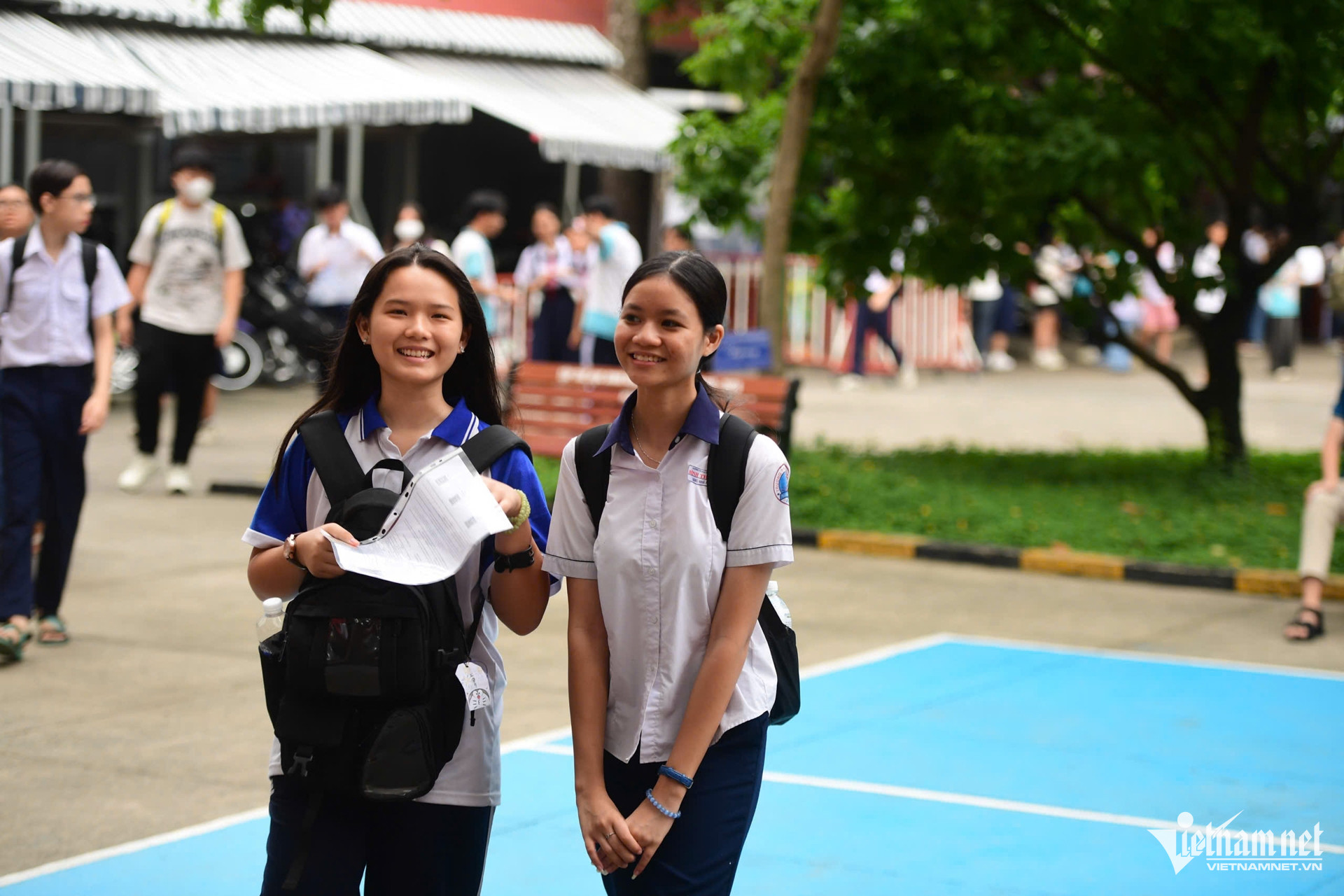 Hải Phương và Huỳnh Hoa cùng nhau ôn lại kiến thức Ngữ văn. Hà Phương cho biết đây là một kỳ thi em đặt nhiều kỳ vọng và đã chuẩn bị tâm lý vững vàng để làm bài: “Cách đây khoảng một tuần, em khá lo lắng. Tuy nhiên được gia đình, thầy cô động viên nên hôm nay em cảm thấy không áp lực, rất thoải mái”.